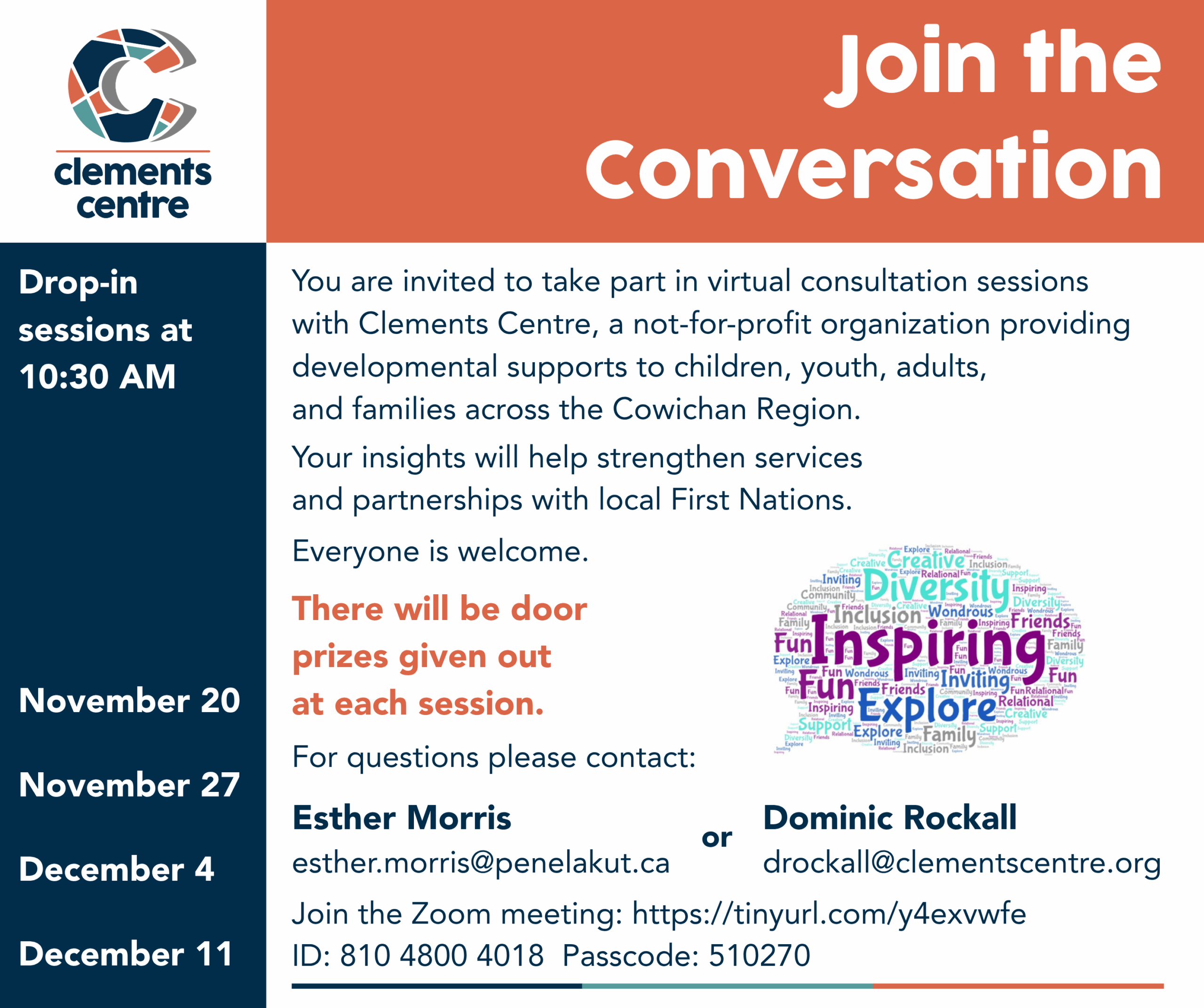 You are invited to take part in virtual consultation sessions with Clements Centre, a not-for-profit organization providing development supports to children, youth, adults, and families across the Cowichan Region.