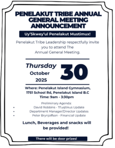 Penelakut Leadership would like too Respectfully invite all Penelakut members to attend the Annual General Meeting!